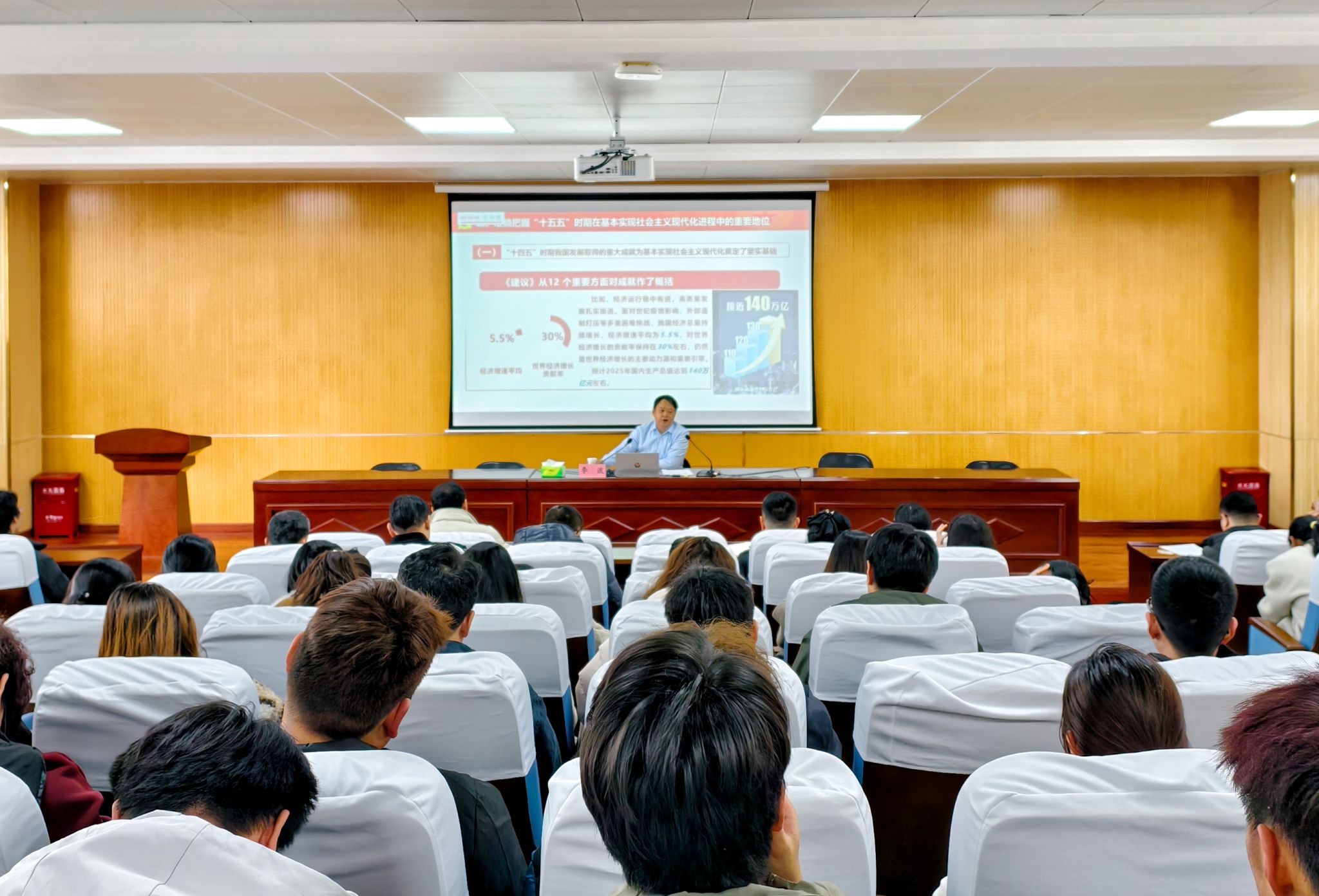 李波首先介绍了全会的基本情况,并以《学悟党的二十届四中全会精神,扛起“十五五”奋进新使命》为题,围绕全会通过的《中共中央关于制定国民经济和社会发展第十五个五年规划的建议》和习近平总书记在党的二十届四中全会上的重要讲话精神,从准确把握“十五五”时期在基本实现社会主义现代化进程中的重要地位、深刻领会“十五五”时期经济社会发展的指导方针和主要目标、全面理解“十五五”时期经济社会发展的战略任务和重大举措、坚持和加强党的全面领导,凝聚起推进中国式现代化的磅礴力量等方面作了系统讲解和深入阐释。