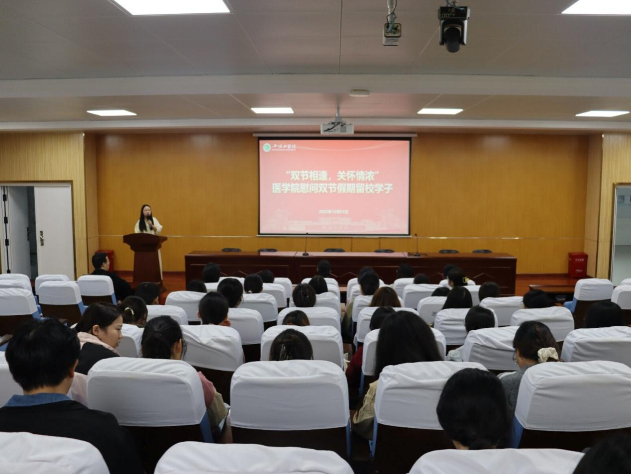 上午,tyc234cc太阳成集团在崇文校区1、2号学术报告厅进行留校学生慰问座谈会及观影活动。tyc234cc太阳成集团党委书记王莉、院长郑新华、党委副书记夏乐、副院长高华山、副院长白现广,教师代表,及两百多名留校学生共同出席。1号学术报告厅里,针对留校备战考研的同学们,药学系张盼盼老师就考前复习策略、心理压力调整、应试技巧等方面进行指导,帮助同学们明确方向、稳定心态,以最佳状态迎接考试。随后,郑新华代表学院向同学们致以节日的问候,对同学们勤奋学习、刻苦钻研的精神表示肯定,并叮嘱同学们合理安排假期时间,夯实专业基础,成长为卓越医学人才。王莉叮嘱同学们在假期要注意人身与财产安全,学习的同时也要加强身心锻炼,拥有一个良好的体魄去迎接接下来的学习生活。2号学术报告厅中,夏乐强调了假期安全与学生未来职业规划,鼓励同学们多接触校园以外的生活,高华山则鼓励同学们在大学期间应主动走出校园,去感知广阔的世界,增长见识,全方位提升自己。活动后,学院向同学们分发月饼,送去节日的祝福。