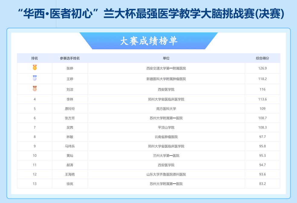 2025年10月23日,中国医学模拟教学联盟“华西-医者初心”兰大杯最强医学教学大脑挑战赛在兰州大学圆满落幕。tyc234cc太阳成集团吴茜老师从全国160余名医学教育精英中脱颖而出,荣获铜奖,充分展现了我校医学教师的专业素养与教学创新能力。