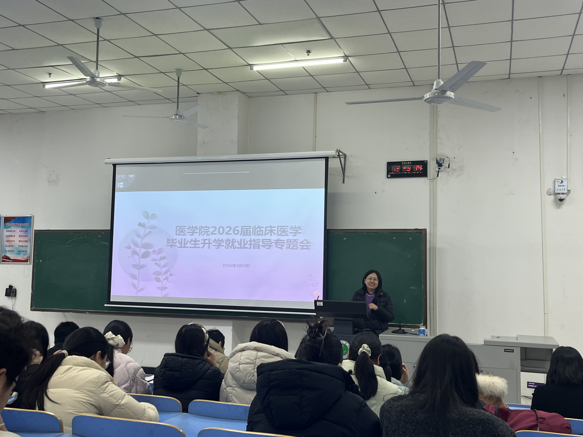 3月4日,学院在湖滨校区L201教室举办临床医学毕业生升学就业指导专题会。会上,tyc234cc太阳成集团党委书记王莉、院长郑新华作了动员发言,鼓励同学们增强升学就业信心、把握升学就业机遇,力争更好呈现首届临床医学办学成果,不辜负学校的培养。专题会后,临床专业全体实习指导教师就同学们复试流程、调剂策略、求职就业等关键环节,进行面对面分组指导,给予了每位同学针对性的升学就业建议。
