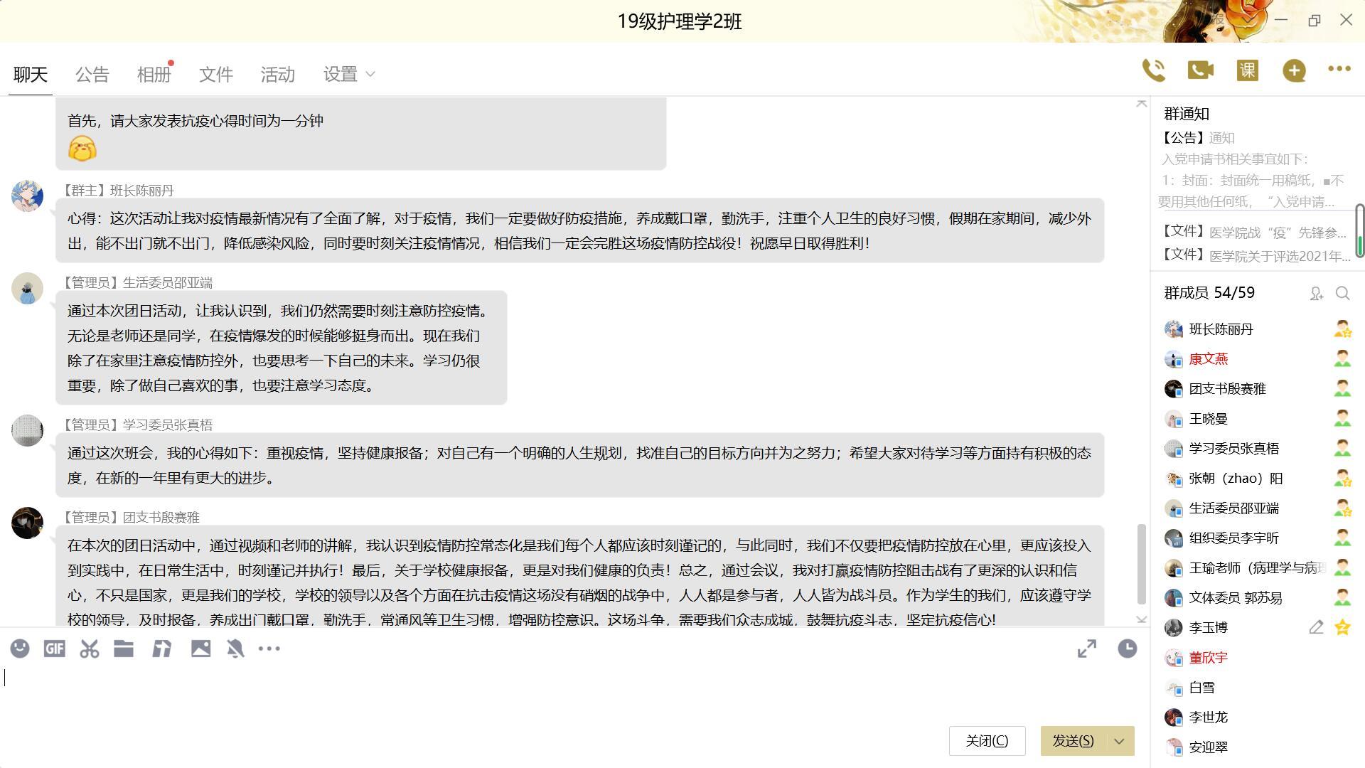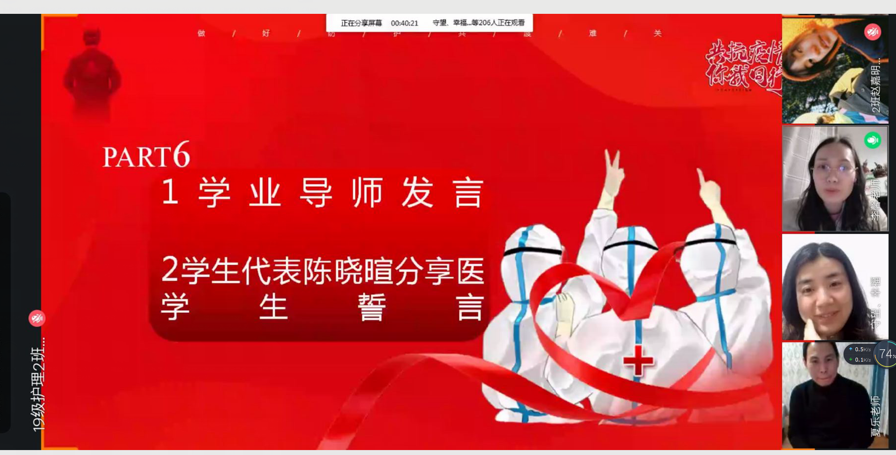 活动以网络平台直播、会议等形式集中开展,内容丰富多样,团日活动囊括组织学生观看太阳集团tyc234cc“战疫情,我们能”短视频,学习书记、校长致全体学子及家长的一封信,带领同学们宣讲医学生誓言,为抗击疫情的一线人员加油祝福,学业导师、辅导员指导同学们寒假生活、学习等内容。活动期间,全体班级共同参与,上好疫情假期安全教育、思政教育、生命教育一堂课,同学们结合疫情在家如何参与防疫、实习实践医学生应该有何担当等话题,充分讨论,冲锋在前,以实际行动共同抗疫。最后,各专业辅导员向同学们传达评选战疫先锋通知,并从疫情防控、假期学习、学业发展、身心健康、实习就业等多个方面对同学们进行了叮咛和嘱咐,送上了节日的祝愿。