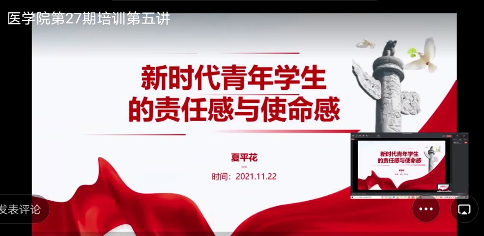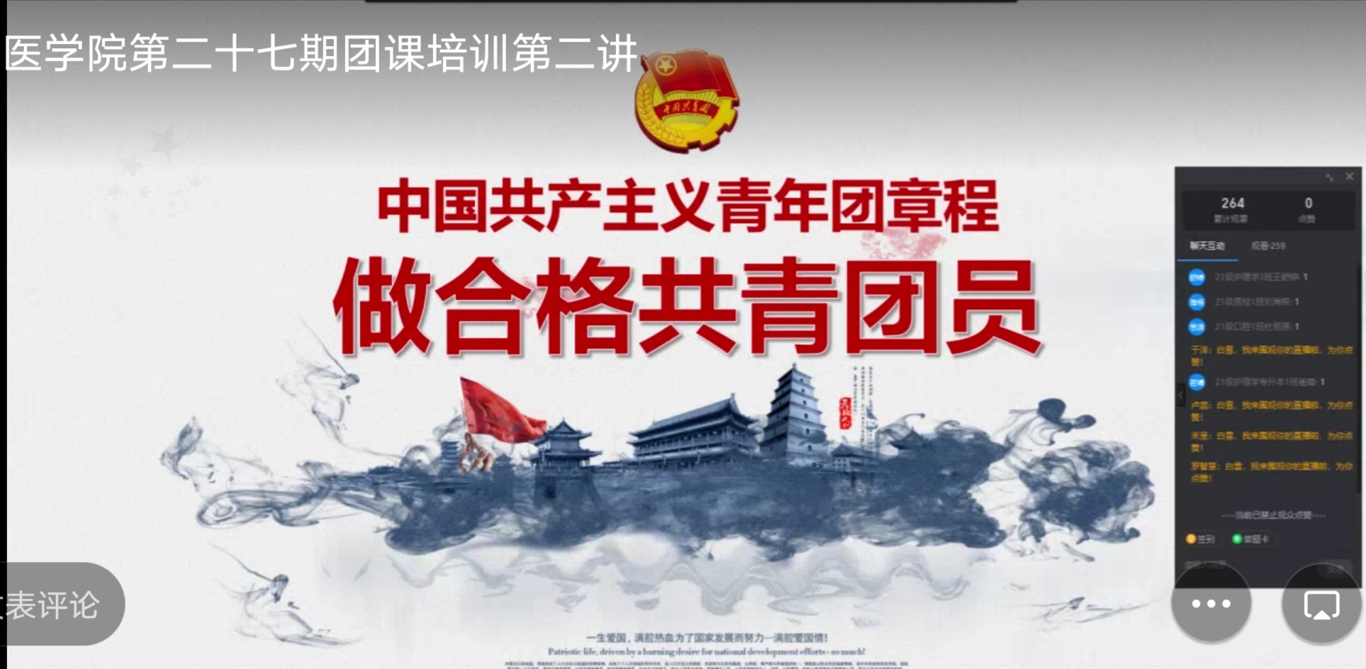 为进一步深入学习贯彻习近平新时代中国特色社会主义思想、党的十九大精神和团的十八大精神,认真贯彻落实习近平总书记“七一”重要讲话精神,tyc234cc太阳成集团按照疫情防控要求,于11月18日—22日采取线上钉钉直播的形式,顺利举办第二十七期团课培训活动。此次团课培训由团委书记夏乐、辅导员夏平花以及三位学生代表白雪、郭娜、乐艺主讲,参加的团员代表共计303人。