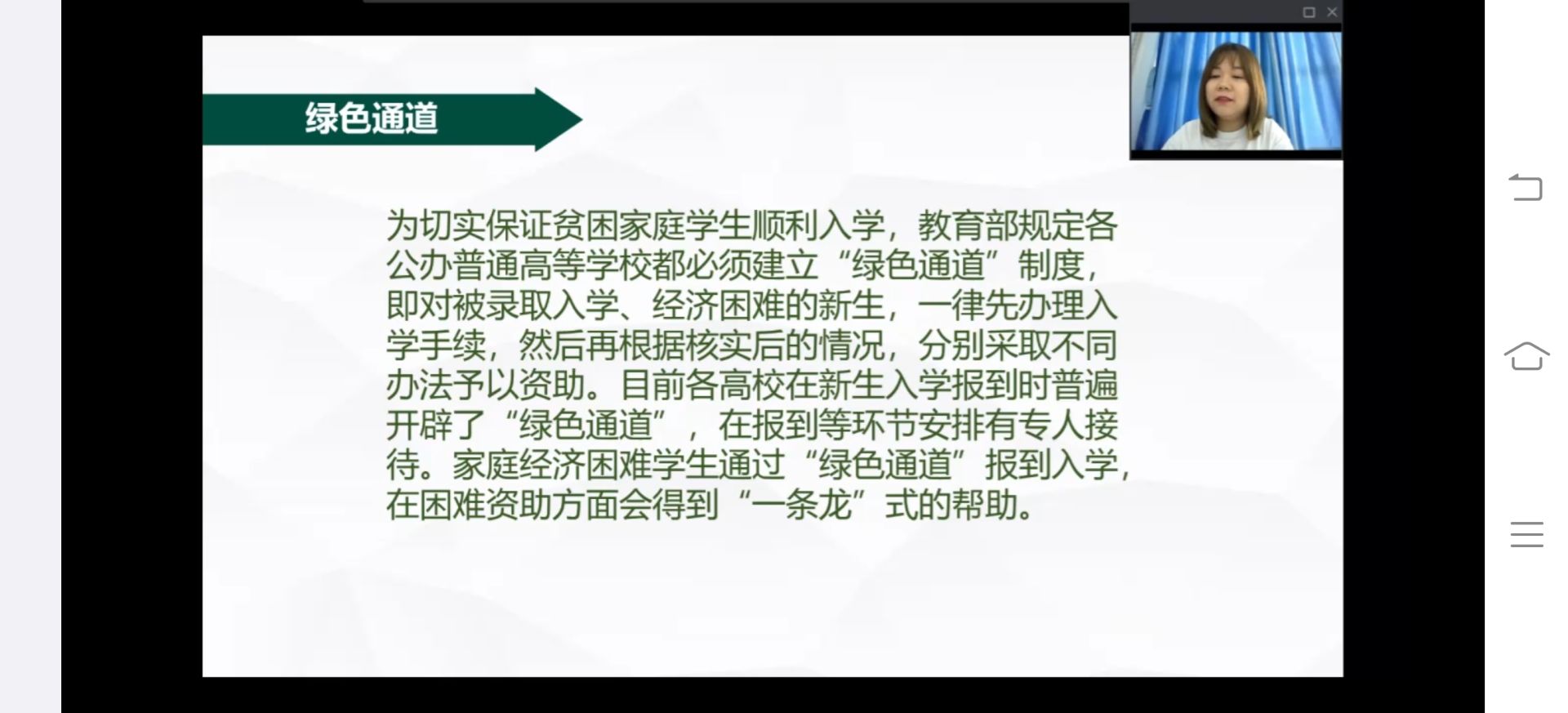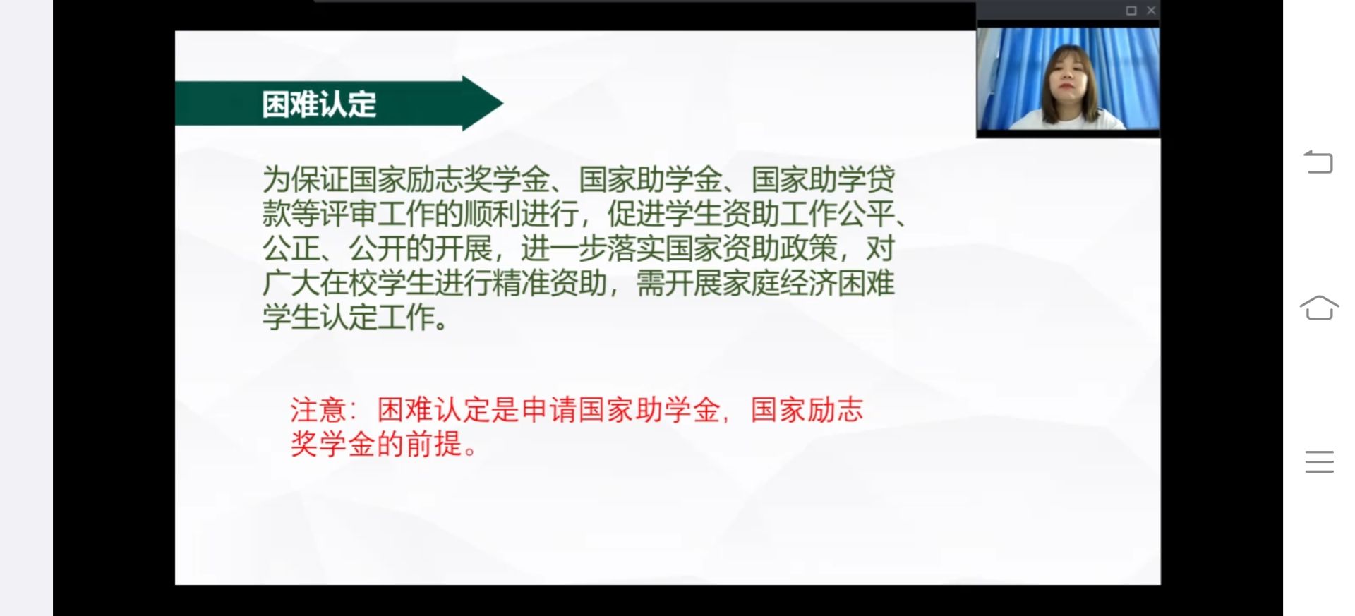 首先,高杨指出绿色通道可以极大的保证更多贫困学生入学。她向同学们介绍了助学贷款的两种形式:高校国家助学贷款和生源地信用贷款,以及他们的区别与形式。紧接着,高杨借助当下正在进行的工作向同学们解读了困难认定的具体步骤与方法。困难认定分为特殊困难困难一般困难三种,并且对于三种程度的困难有三档资助力度。最后,她对奖学金以及入伍大学生国家给予补助进行了具体讲解,使同学们对学校资助政策有了更深刻的认识。