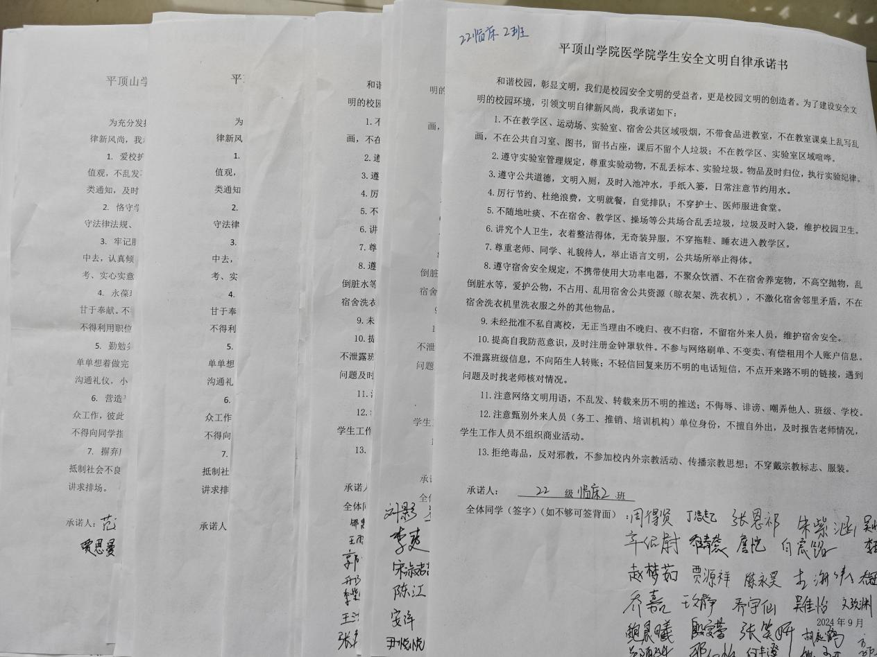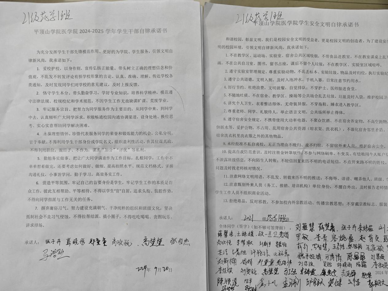 进入大学,树立起为自己行为负责的意识是大学生的第一节必修课。为创造文明平安校园,加强学生安全意识,提高校园、宿舍文明自律规范,tyc234cc太阳成集团全体在校生在2024年9月20日签订了文明自律承诺书,全体学生干部签订了tyc234cc太阳成集团2024-2025学年学生干部自律承诺书。